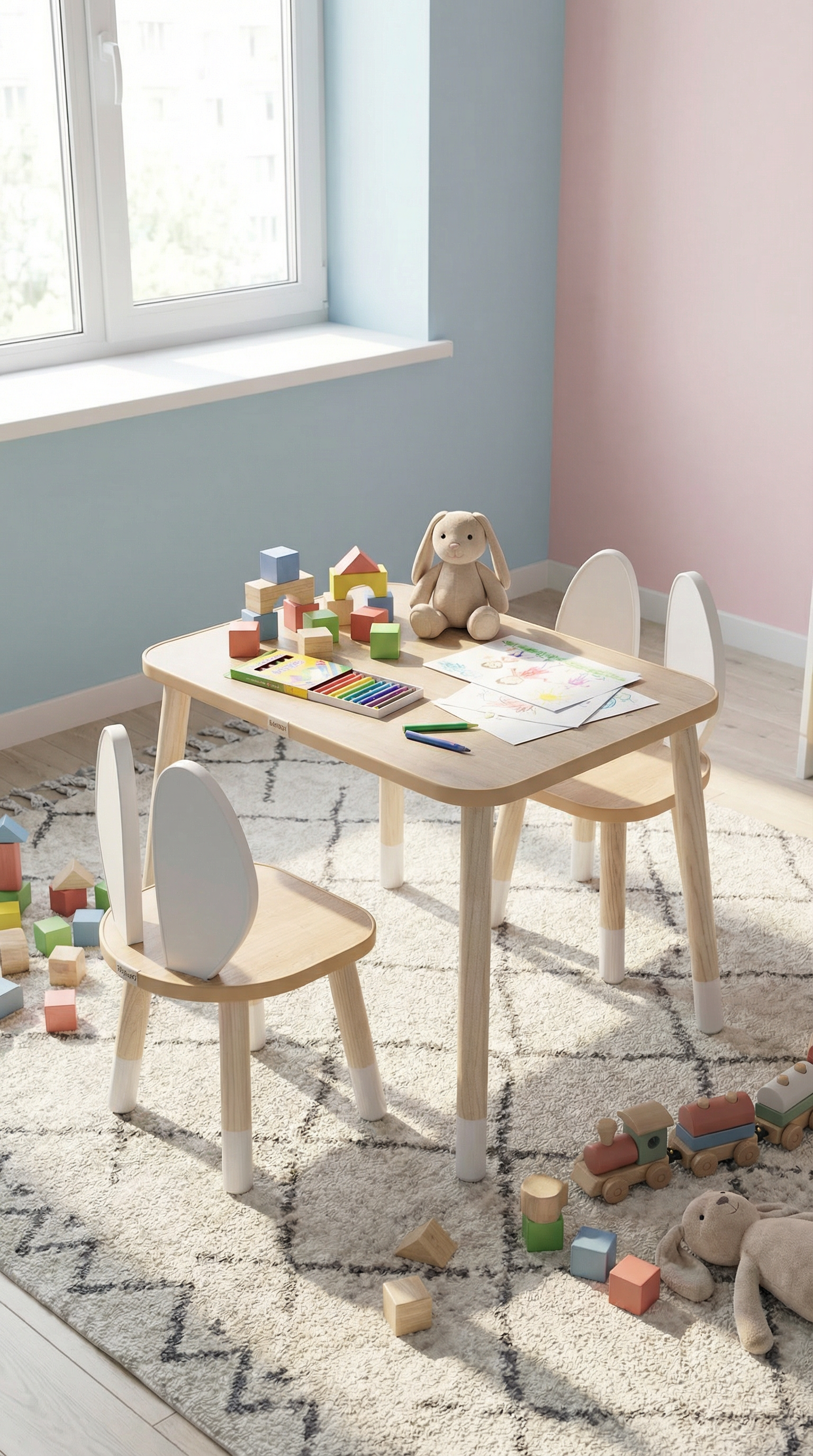 Tasarımda çocukların rahatlığı ön planda tutulmaktadır. Masa yüzeyi geniş ve kullanışlıdır. Böylece çocuklar kitap okuyabilir, resim yapabilir veya oyun oynayabilir. Sandalye ise çocukların oturma pozisyonunu koruyacak şekilde şekillendirilmiştir. Ayrıca ürünlerde kullanılan malzemeler dayanıklı ve çevre dostudur. Hem estetik hem de fonksiyonel tasarımıyla dikkat çekmektedir.
